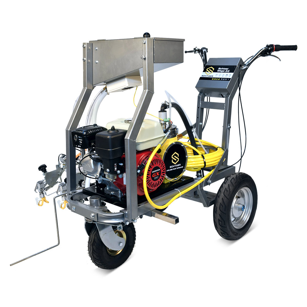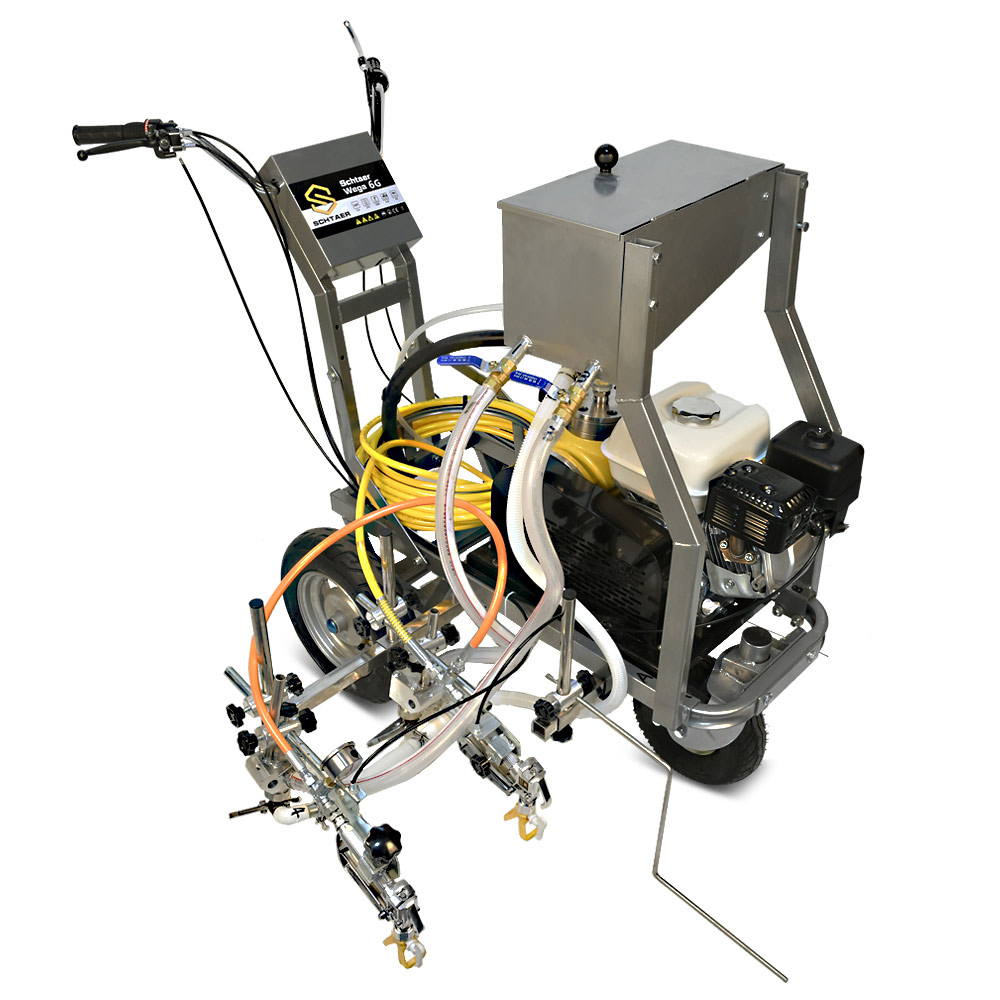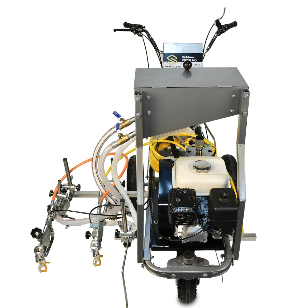 Schtaer WEGA 6G - разметочная машина для безвоздушного нанесения дорожной разметки краской на асфальт. Разметочная машина собрана на базе мембранного насоса для краски и бензинового двигателя. Машину для нанесения дорожной краски можно толкать, также ее можно использовать как подающий мембранный насос с бензиновым двигателем и держать машину в кузове грузовика, и наносить краску окрасочным пистолетом вручную по шаблону. Машина может наносить как прямые линии, так прерывистые. Также, благодаря переднему поворотному колесу, можно наносить радиусы, фиксируя переднее колесо под нужным углом. Машина может наносить двойные сплошные и прерывистые линии, пешеходные переходы. Модель оснащена комплектом для стеклошариков для нанесения светоотражающих линий.