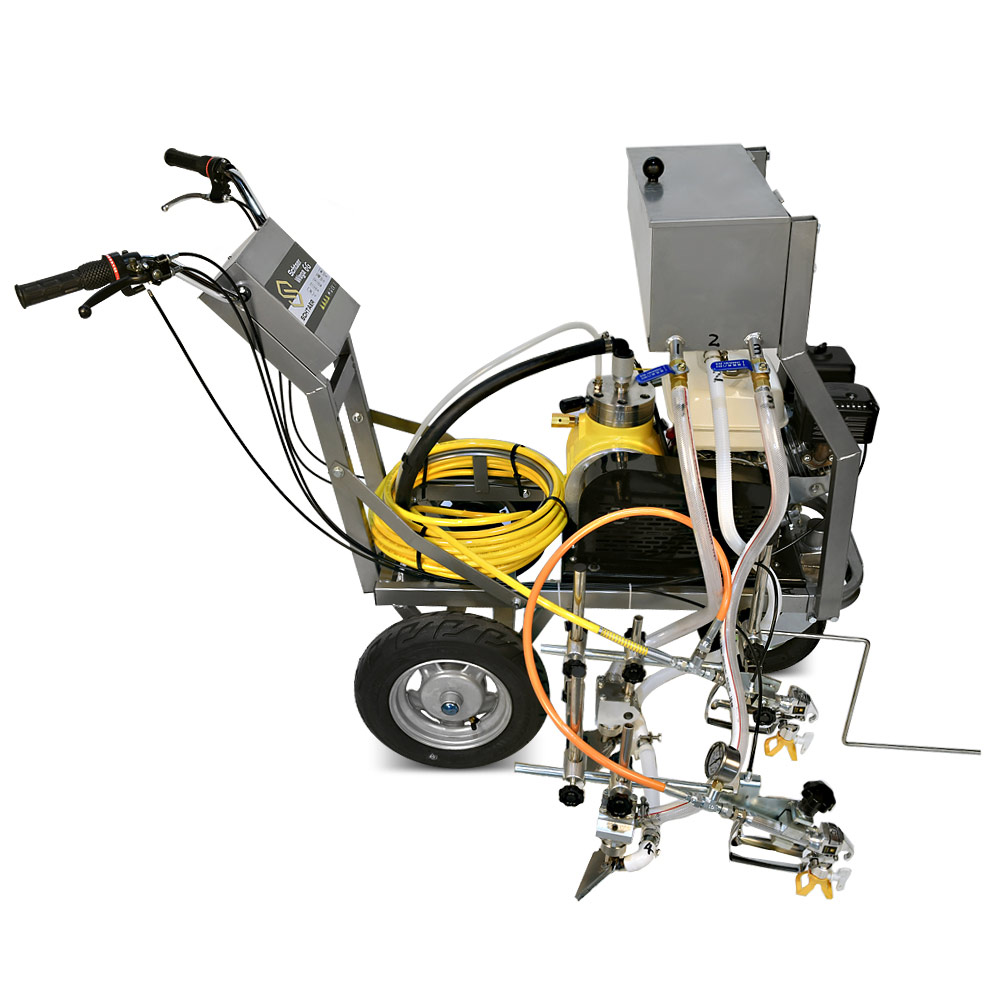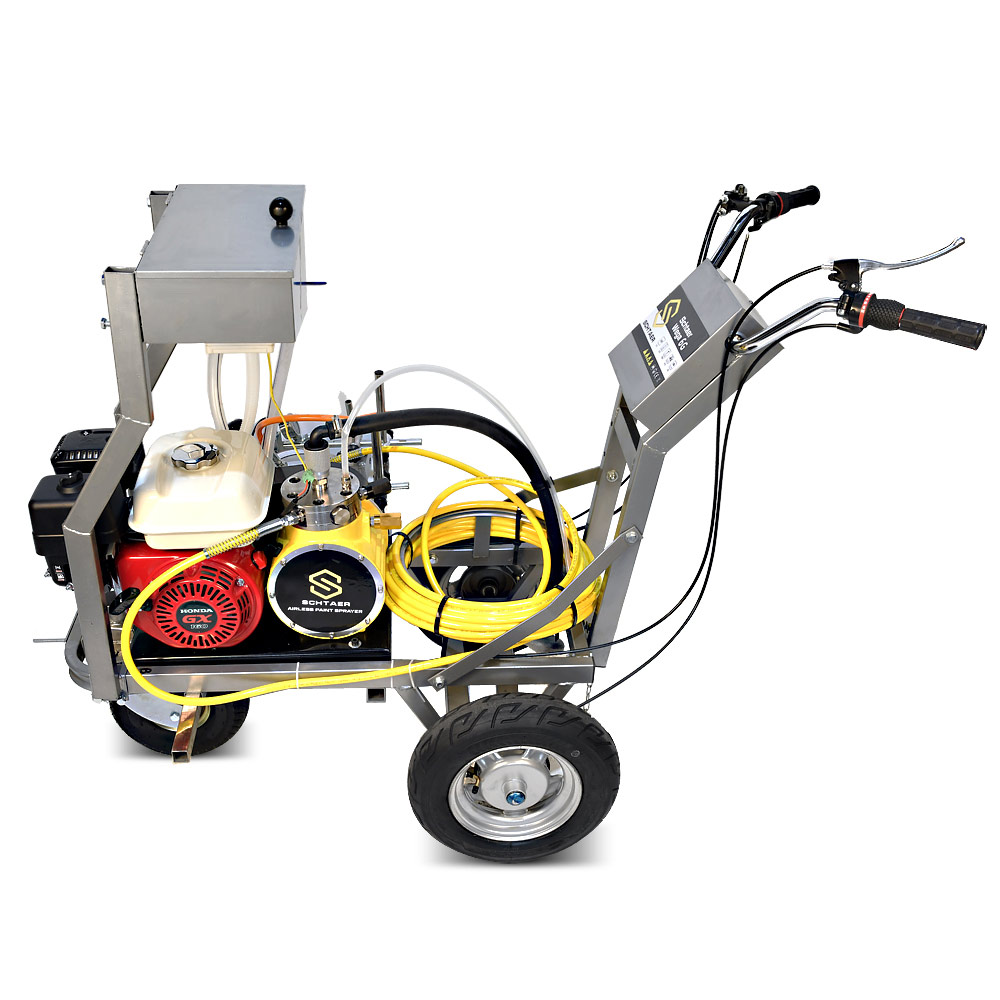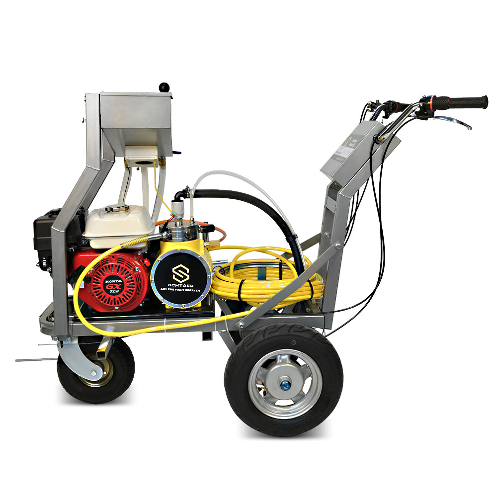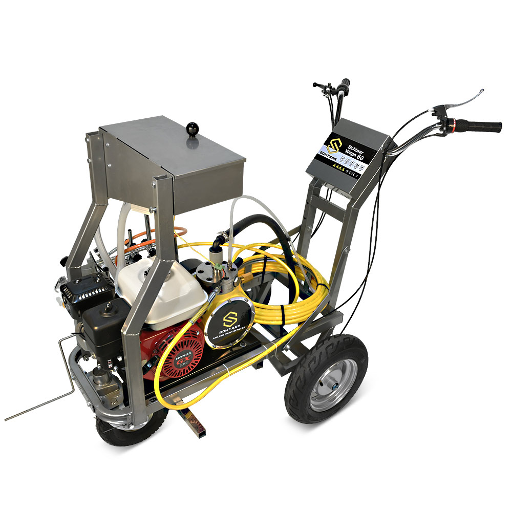 Schtaer WEGA 6G - разметочная машина для безвоздушного нанесения дорожной разметки краской на асфальт. Разметочная машина собрана на базе мембранного насоса для краски и бензинового двигателя. Машину для нанесения дорожной краски можно толкать, также ее можно использовать как подающий мембранный насос с бензиновым двигателем и держать машину в кузове грузовика, и наносить краску окрасочным пистолетом вручную по шаблону. Машина может наносить как прямые линии, так прерывистые. Также, благодаря переднему поворотному колесу, можно наносить радиусы, фиксируя переднее колесо под нужным углом. Машина может наносить двойные сплошные и прерывистые линии, пешеходные переходы. Модель оснащена комплектом для стеклошариков для нанесения светоотражающих линий.