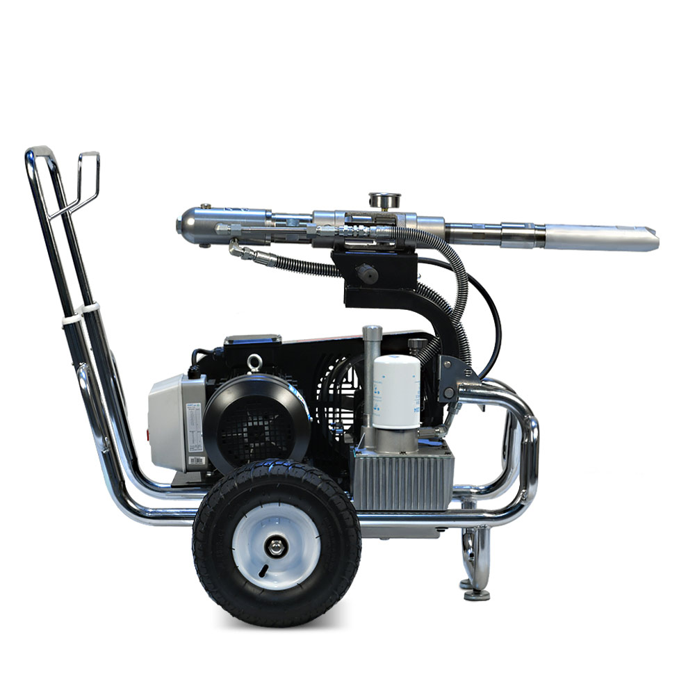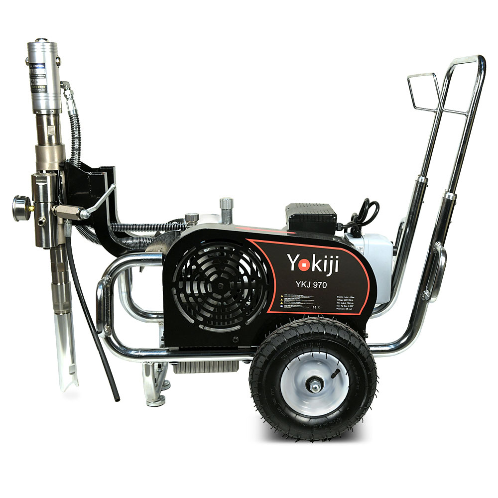 YOKIJI YKJ 970 – гидропоршневой безвоздушный электрический окрасочный аппарат. Он может применяться для распыления материалов с высокой, средней и низкой вязкости: красок, эмалей, шпаклевок, огнезащитных, гидроизоляционных, антикоррозийных и цинконаполненных составов, мастик, грунтовок. Аппарат используется на стройплощадка при отделке помещений, зданий и сооружений, а также на производствах при покраске больших конструкций. Модель работает от розетки 220B и обладает высокой производительностью (10 л/мин); позволяет присоединять до 3 малярных постов и подавать материал на высоту до 90 метров.