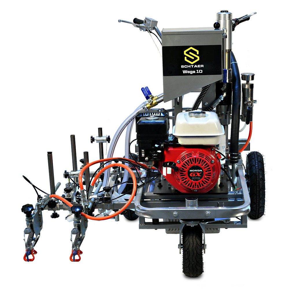Schtaer Wega 10 - оснащена поршневым гидравлическим насосом для краски, бензиновым мотором HONDA, двумя пистолетами для дорожной краски, баком для стеклошариков и двумя пистолетами для их распыления. Машина установлена на трехколесную тележку с двумя задними фиксированными и одним передним поворотным колесом. Управление распылением краски осуществляется на рукоятке разметочной машины, фиксация переднего колеса также осуществляется на рукоятке.