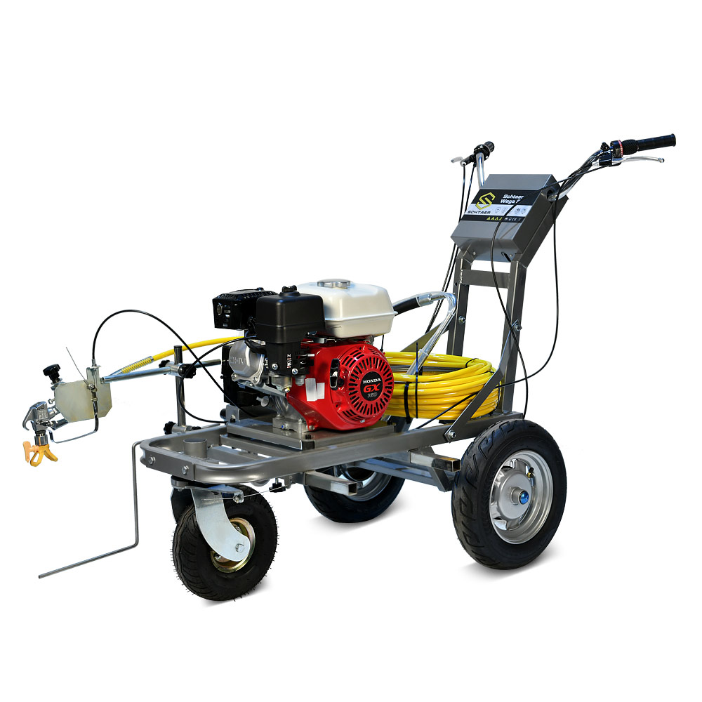 Schtaer Wega 5 - машина для нанесения дорожной разметки краской на асфальт. Разметочная машина собрана на базе поршневого насоса для краски и бензинового двигателя. Разметочную машину для нанесения дорожной краски можно толкать, также ее можно использовать как подающий поршневой насос с бензиновым двигателем и держать машину в кузове грузовика, и наносить краску окрасочным пистолетом вручную по шаблону. Машину может наносить как прямые линии, так прерывистые. Также, благодаря переднему поворотному колесу, можно наносить радиусы, фиксируя переднее колесо под нужным углом. Максимальная длина шланга 60 метров. Сопло 1908.