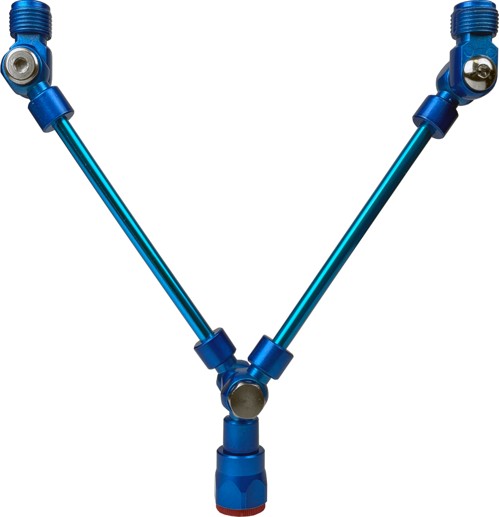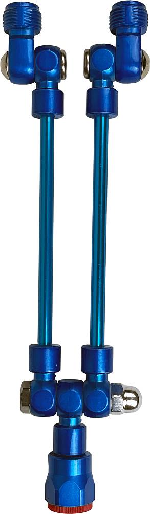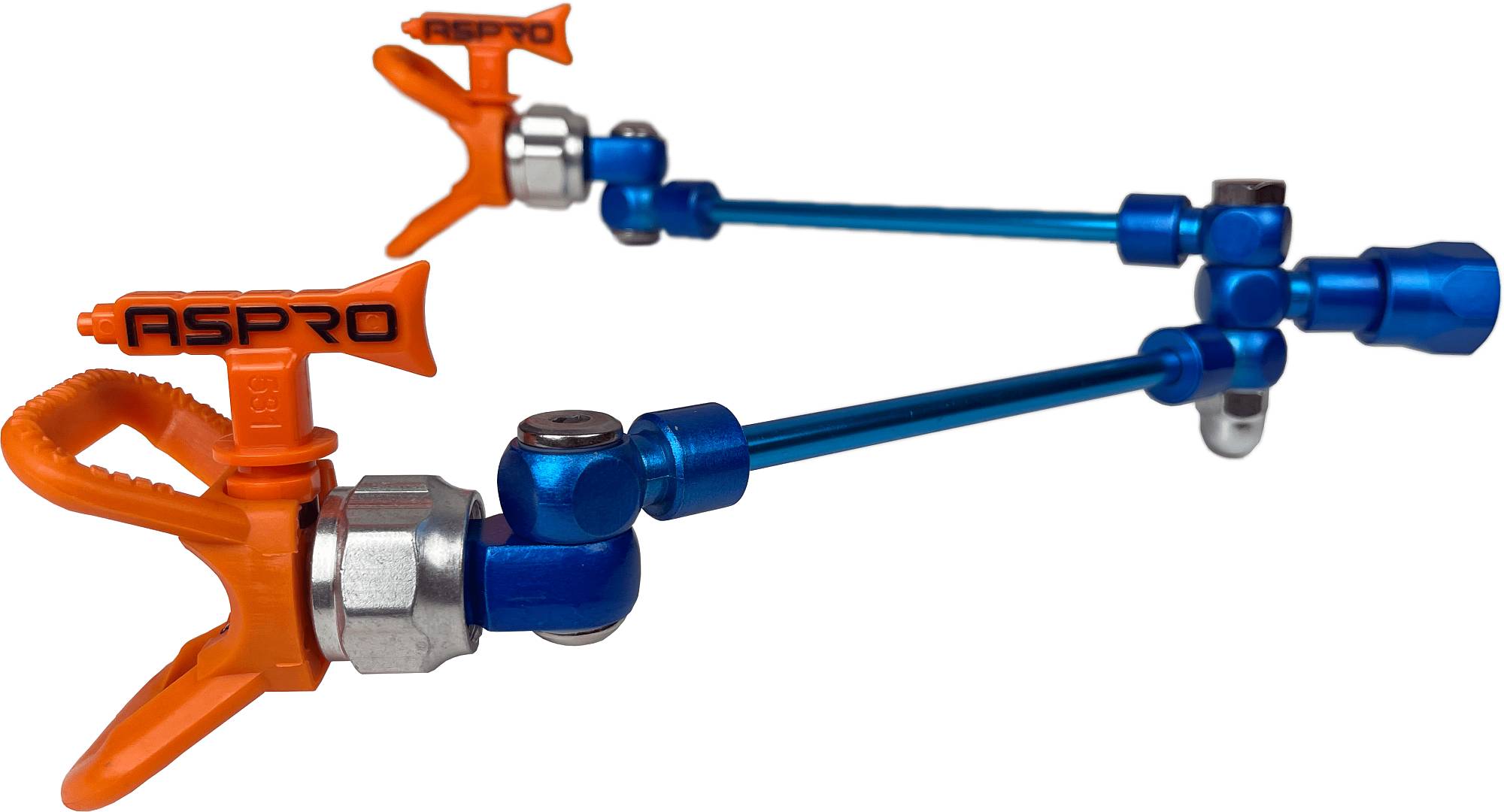 Применение этого устройства позволяет увеличить скорость окраски поверхности в 2 раза. Соплодержатель с соплом устанавливается на каждую из двух удлинительных трубок. Затем устанавливается необходимый угол разведения трубок, соответствующий ширине факела каждого сопла с учетом необходимого перекрытия.