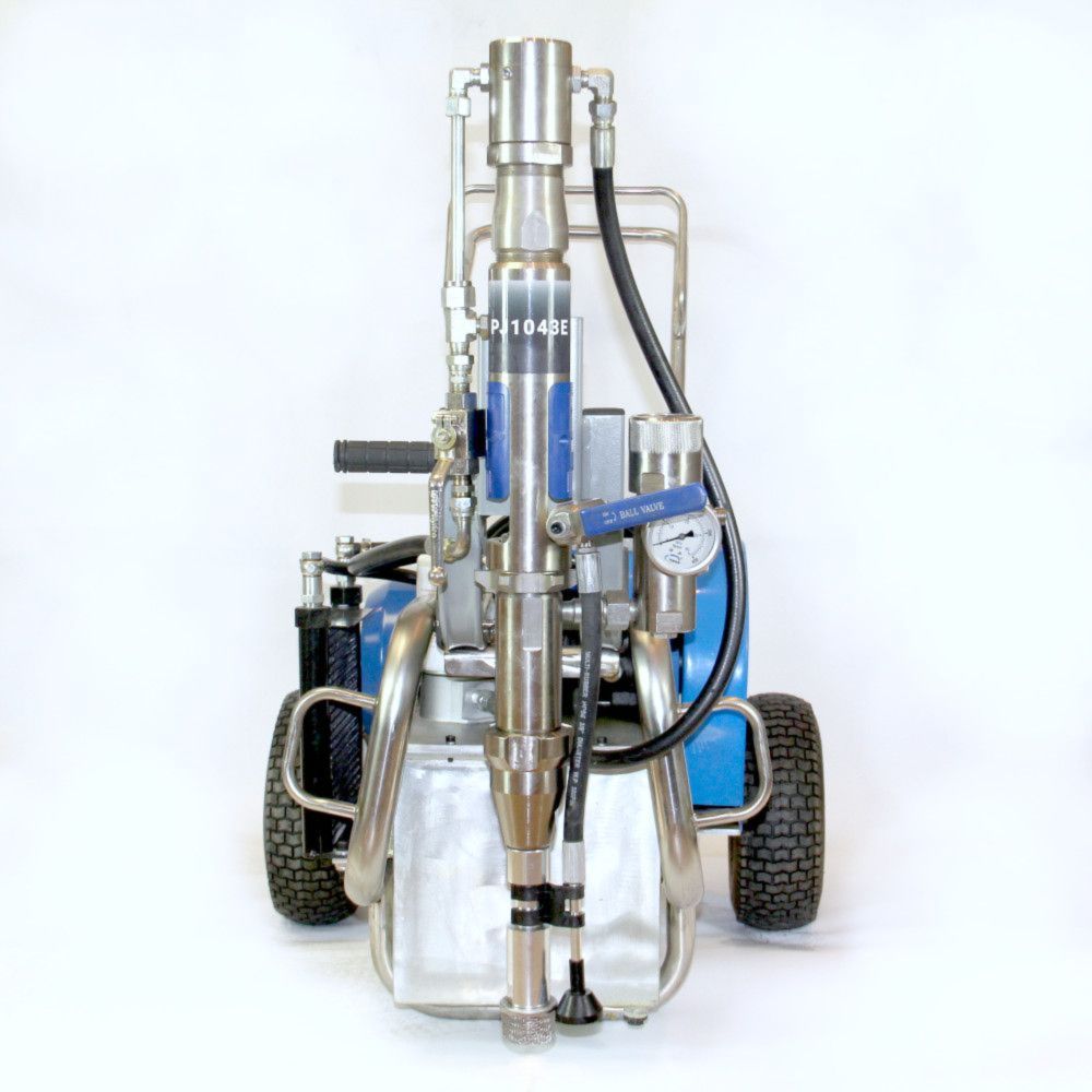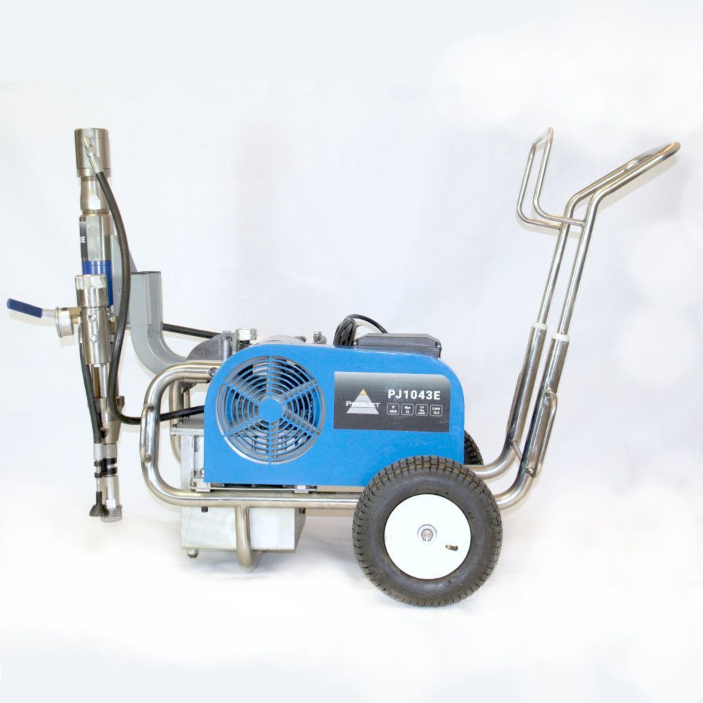 Безвоздушный окрасочный аппарат PremJet PJ 1043E с электрическим приводом и пневматическим насосом предназначен для профессионального применения ЛКМ высокой вязкости с содержанием абразивов для грунтования и окраса больших объёмов в промышленности и на производстве, для нанесения полимерной шпатлёвки, огнезащитных и двух компонентных составов с одновременным применением двух краскораспылителей.