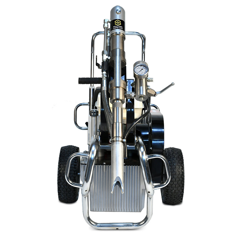 Schtaer Jupiter 14G – это безвоздушный бензиновый окрасочный аппарат, предназначенный для распыления красок с высокой степенью вязкости. Его также используют при работе с огнезащитными составами, гидроизоляционными материалами, антикоррозионными красками, шпатлевками, цинконаполненными материалами, эмалями, мастиками, грунтовками и другими лакокрасочными материалами, предназначенными для нанесения через поршневой безвоздушный окрасочный аппарат. Сферы применения этой модели разнообразны. Ее используют для покраски стен, фасадов и потолков, металлических конструкций, бассейнов, крыш и куполов. Она может применяться при работе с балками, заборами, мостами и тоннелями, изготовленными из металла. Профессиональный аппарат подходит для нанесения дорожной разметки, но при этом потребуется дополнительное оборудование. Модель обладает высокой производительностью (14 л/мин), работает под давлением 230 Бар при мощности 4 000 Вт.